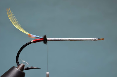70 deniers u 8/0 y sujetamos el tinsel redondo para el tip, justo a la altura de la base de la lanceta, y lo atamos con
